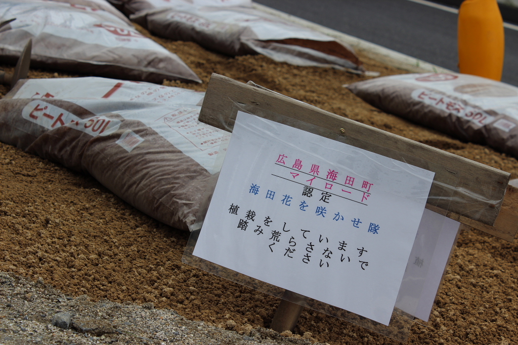 海田花を咲かせ隊 便り 2016/11/08 東広島バイパス空き地17uに植栽 今年の夏、ハダ動物病院の先生から「マスター!海田町の花の種代にして!!」と寄付してもらう そして東洋造園様から植栽用の園芸土と整地 さらに200鉢 (タイム) 葉っぱの小さい種 (ビンカマジョール)つる性 (ハナニラ)!ニラの匂いがする綺麗な花が咲く 鴻治組様から 17u残土の撤去、パンジー200鉢の寄付。 洋伸建設様から植栽費用として20000円の寄付。 海田花を咲かせ隊からWild Flower 種 海田町内に花を咲かせ和める環境の一役に 立てればエエと思います。 思いつきで始めたこの活動も、地元の人々にも周知されてきました。 沢山の企業から行政から支援も頂いています。 今回もクラーク記念国際高等学校の学生4名と西原先生、 東洋造園 鴻治組の皆様のサポートで無事終わりました。 東広島バイパスの工事はまだまだ続きます。 無事終了することを願います。 また空き地があれば花を植えたいと思います。 空き地に花が咲く町 海田町!! 実にエエと思います。 アレルギー植物なら厄介ですが、綺麗な花が咲けば和めます。 この日 小雨で中止になるかも?と不安もありましたが、ナンと30分前には傘もささない状況!! そして鴻治組の皆さんのご協力を得て安全に植栽も終わりました。 通行する人からも、声かけありがとうございます。 後は根付きを待つだけ!! 来年の3月頃からワンサカ咲きますよ!! PS 一人ですると何時間もかかる!!無謀と言われる 二人ですると半分の時間で終える!!しかし、好きな奴と言われる 10人ですればわずかな労力!!多分?良くやるなと言われる みんなですれば分けない!!これなら直ぐ終わるな!!と言うはず そーみんながすればもっと良くなるはず 家の前の空き地に花の種を蒔けばいたる場所から綺麗な花が咲き 実におもしろく和める町ができるはず!! 17uに合計400鉢と WildFlower!種はこちら!! (宿根性品種の開花は播種の翌年からとなります)